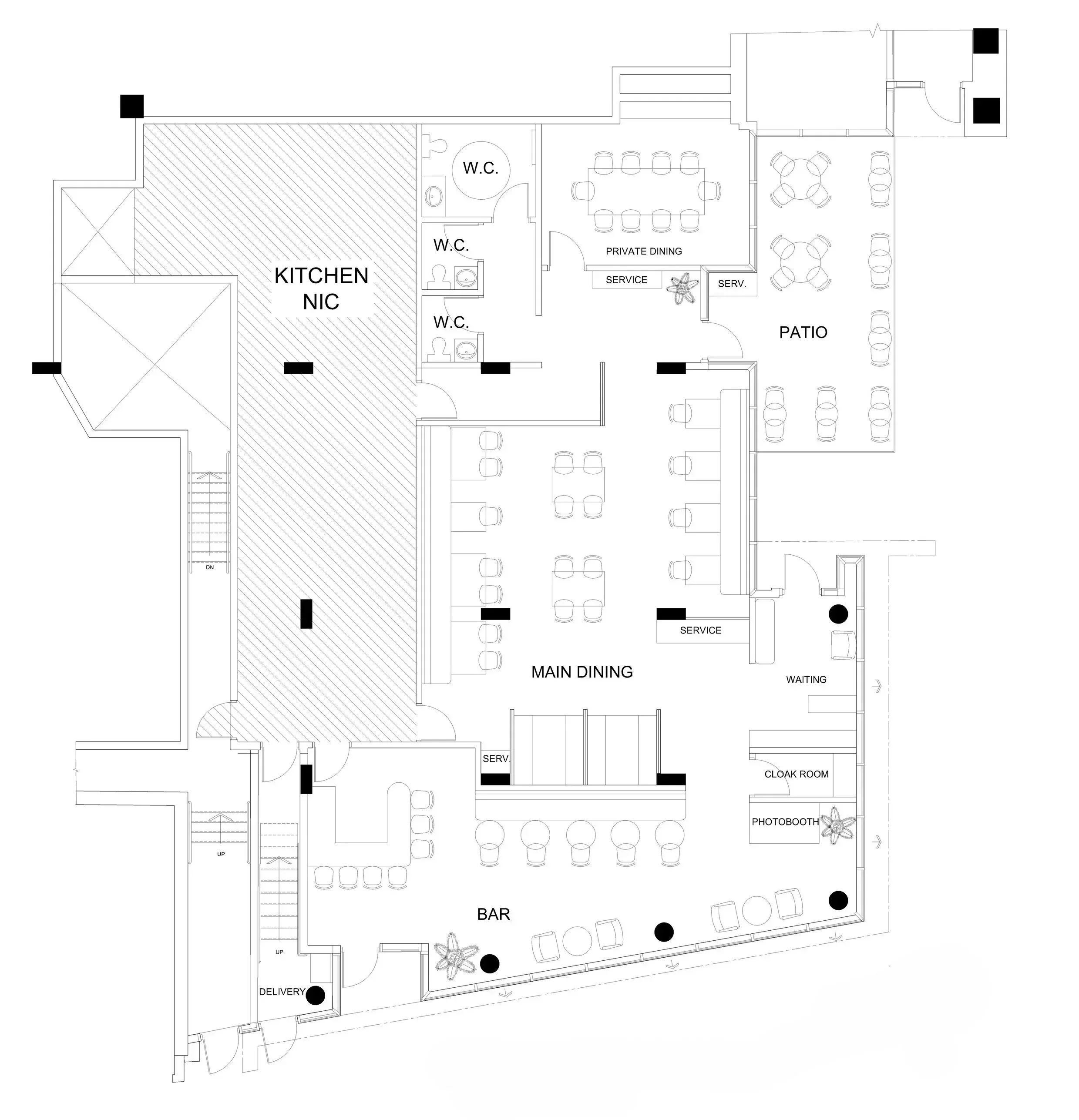 Floor Plan showing seating furniture plan within Main Dining Room, Bar, Private Dining, and Patio with connections to service stations.